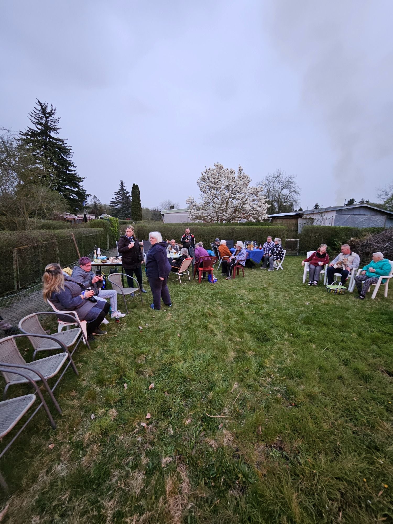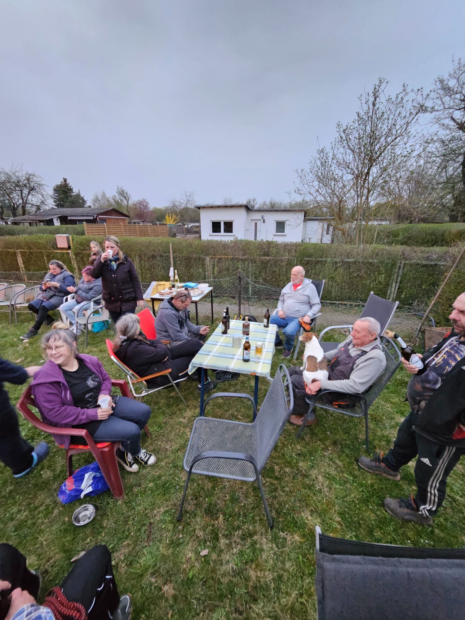 Gemeinsam (u.a. neue Gartenmitglieder ca 1,5 Jahre und langjährige Mitglieder ca. 40 Jahre im Verein) traffen sich zum diesjährigen Brauchtumsfeuer. Alle packten mit an. Zur Stärkung gab es leckere Schmalzstullen mit Gurke.